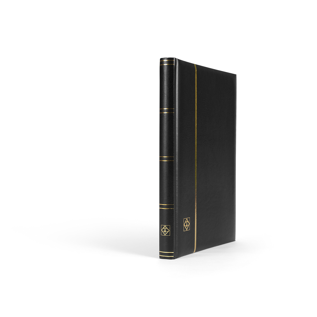 COMFORT A4 stockbook with 32 black pages, padded leatherette cover. The book features 9 clear glassine strips per page, double interleaves with double hinge binding.