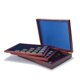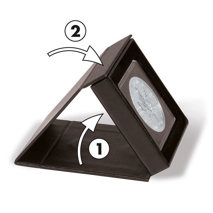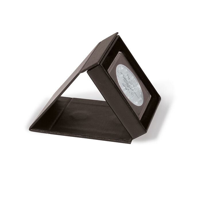 Black coin etui made of sturdy cardboard for QUADRUM capsules. The highlight: with display function for coin presentation. Tray featuring a black velour surface. Unobtrusive magnetic closure.
