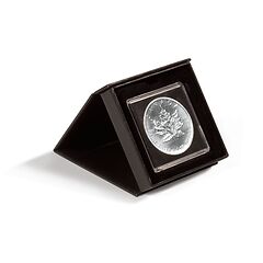 Item number: 801142Black coin etui made of sturdy cardboard for QUADRUM capsules. The highlight: with display function for coin presentation. Tray featuring a black velour surface. Unobtrusive magnetic closure.