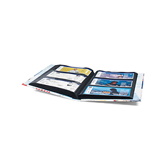 Colorful album for storing up to 156 tickets. With 26 bound sheets for 6 tickets each (when storing two tickets per pocket). The sheets can be filled from the top and have an internal dimension of 216 x 97 mm (8 ½ x 3 ?") (bigger size tickets can protrude upwards without creasing). Each sheet offers secure storage and protection against dirt and grime. Sheets made from clear plastic, allowing you to view both sides of the ticket. The pretty, laminated cover shows a number of illustrations of different tickets from all over the world. Ideal for your valuable and unique memorabilia! Overall size: 329 x 276 x 40 mm (13 x 10 7/8 x 1 5/8").