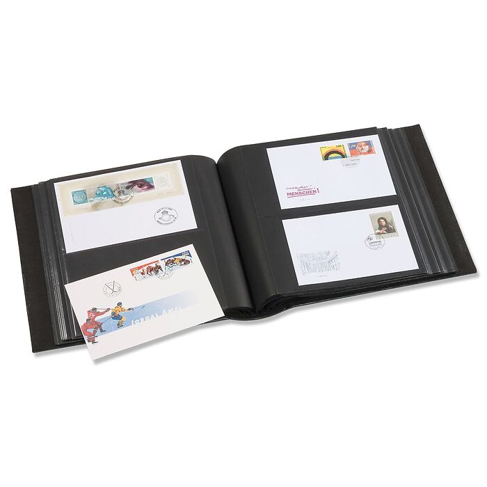 Album to hold up to 200 First Day Covers (FDCs), postcards and presentation packs. With 50 double-sided, clear sheets free from chemical softeners and integrated black interleaves. Sheets bound to spine. Incl. slipcase. Sheet size: 195 x 130 mm. Overall size: 280 x 290 x 86 mm.