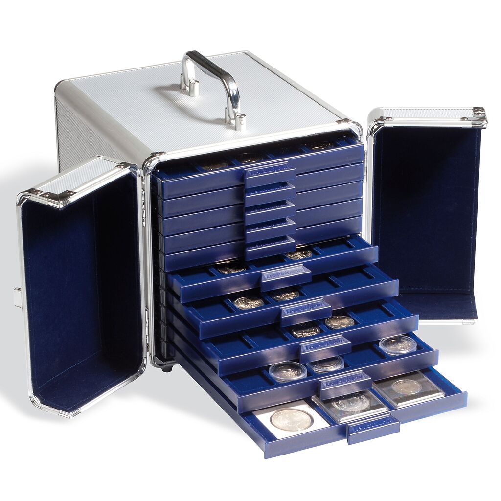 Aluminium coin case for 10 SMART coin drawers. The inside is lined with dark blue velour, lockable (2 keys), with labelling field, sturdy comfortable carrying handle, metal fittings. Prices are for carrying cases without coin boxes. Size (L/W/H): 280 x 213 x 203 mm (11 x 8 2 / 5 x 8").