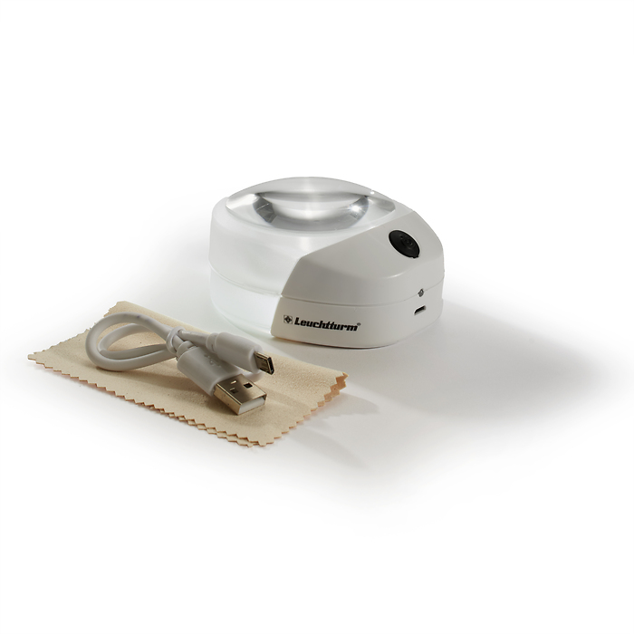 Bright-field magnifier with LED illumination and 10x magnification, rechargeable