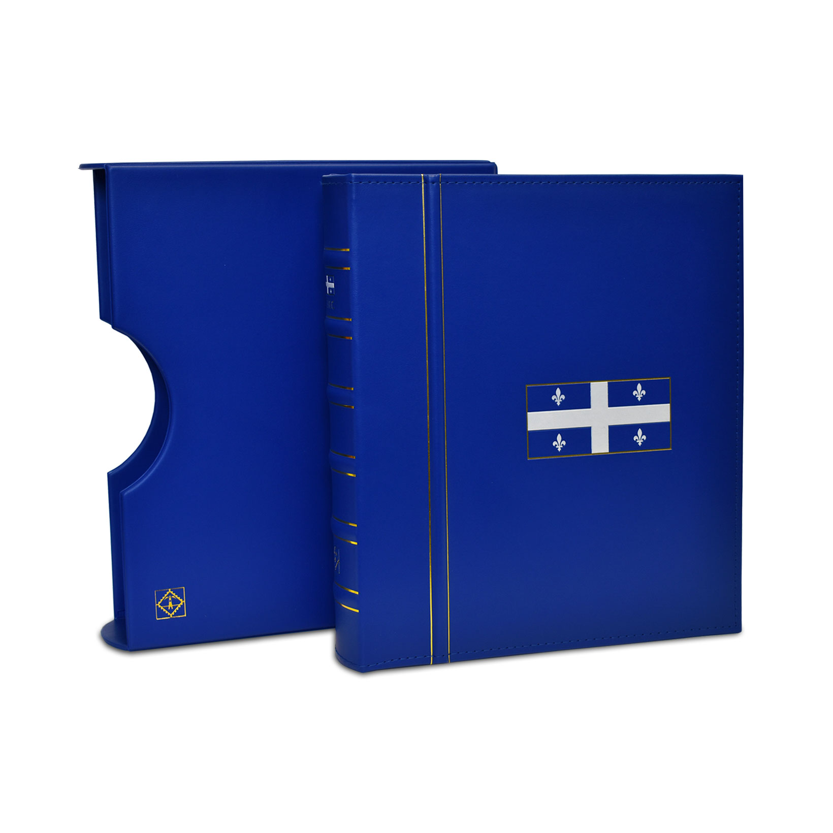 Item number: 362466Classic GRANDE binder with slipcase in Quebec blue with a coloured embossing on cover and spine featuring the Quebec flag and golden “QUEBEC” letters.