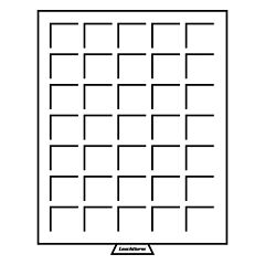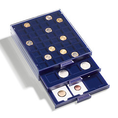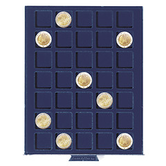 Clear stacking frame with dark blue tray, velvet-blue insert, suitable for safe deposit boxes. This tray is equipped with 35 square compartments and is ideal for storing coins up to a diameter of 27 mm. Overall size (h/w/d): 19 x 195 x 250 mm.