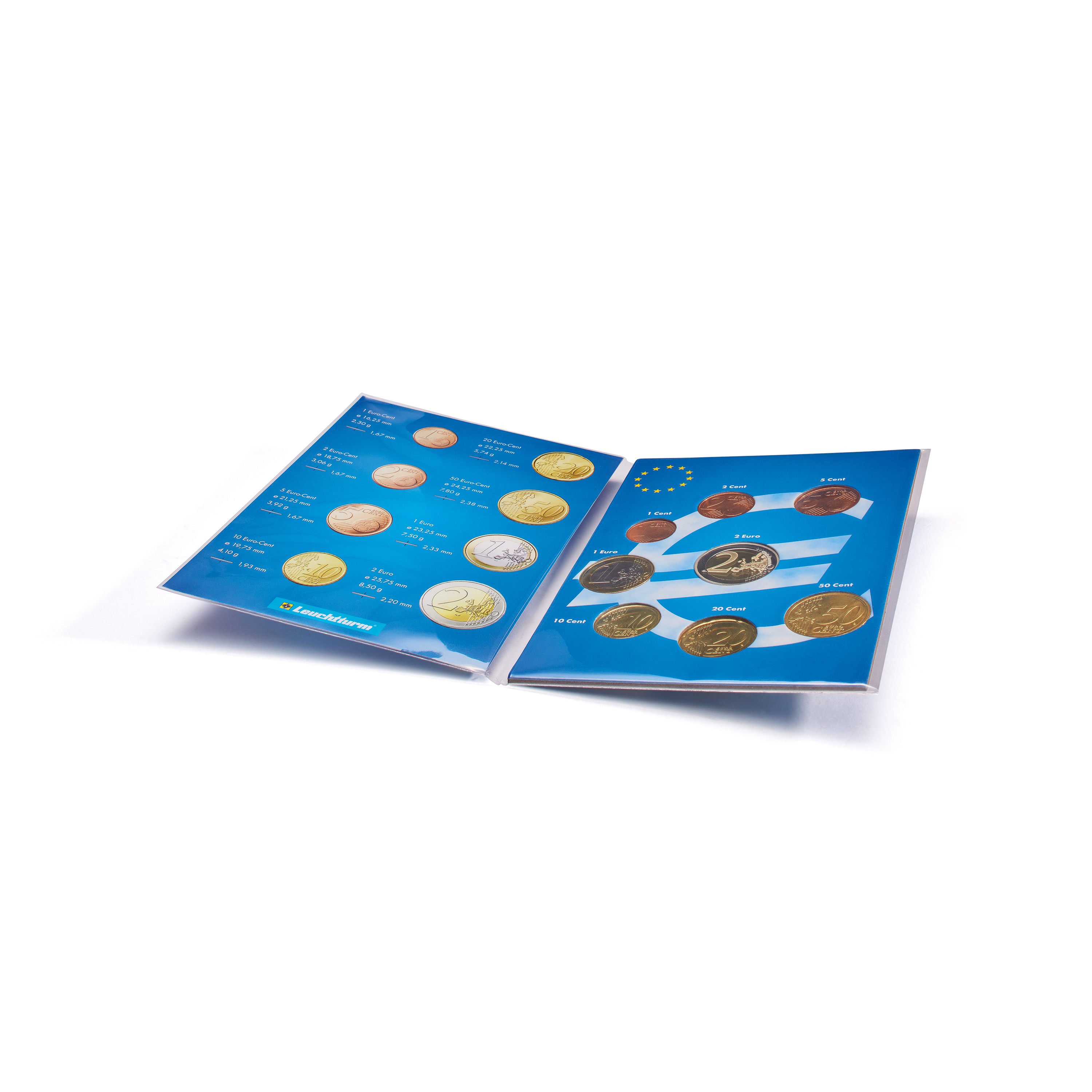 Strong cardboard constructions with cut-outs for one euro coin set with clear protective sleeve. Coins can be viewed from both sides. Overall size: 212 x 144 mm (8 1/3 x 5 2/3").