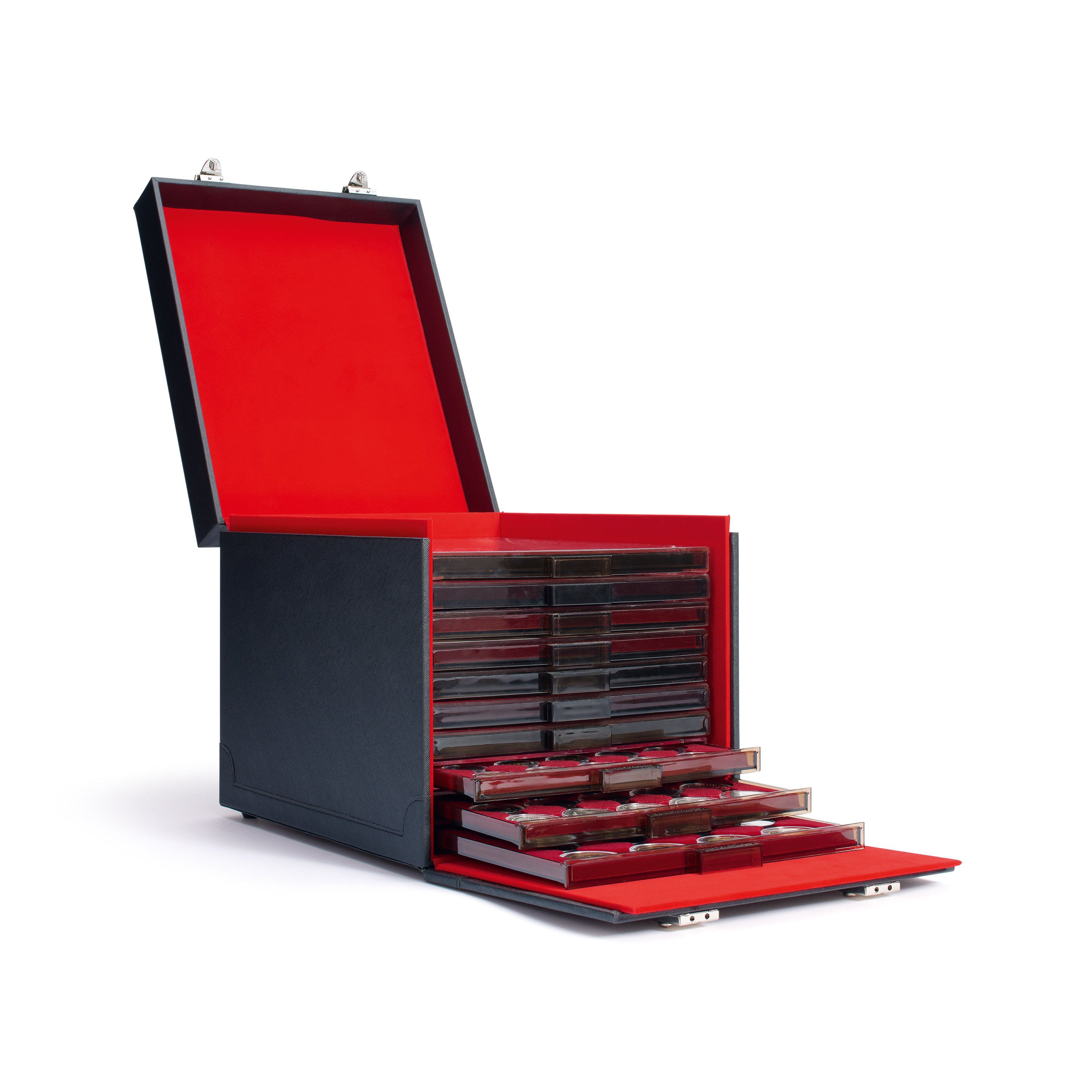 Coin box for up to 10 MB coin boxes or 6 XL coin boxes. Black leatherette case, lined in red velour. Lockable (2 keys). With label holder and stable, comfortable carrying handle. Metal closures and 4 feet. Overall size: 328 x 263 x 263 mm (13 x 10 3/8 x 10 3/8").