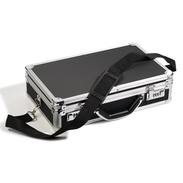 The premium CARGO L6 PRO coin case unites modern, sophisticated design with a high level of functionality and leaves nothing to be desired. The sturdy aluminium frame and metal corner castings are a testament to the exceptional craftsmanship of the case. The combination lock prevents any unauthorised access to your coins, whilst a practical, removable shoulder strap enables convenient and safe transport. The solid interior construction ensures that the trays and coins stay in place, even when held sideways. The case features a black velour lining, padded lid, user-friendly tray removal and a convenient, attractive handle. Case colour: black/silver. Size (L/W/H): 409 x 255 x 102 mm
