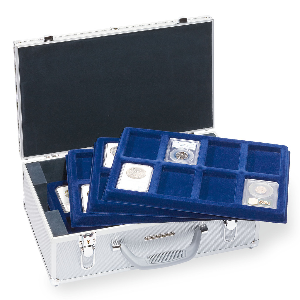 Extra-large case with 12 trays (324 392) for 144 ICCS graded coins. Padded lid. Inner lining in dark blue velour. Rubberized feet. Plated corners. Lockable (2 keys).