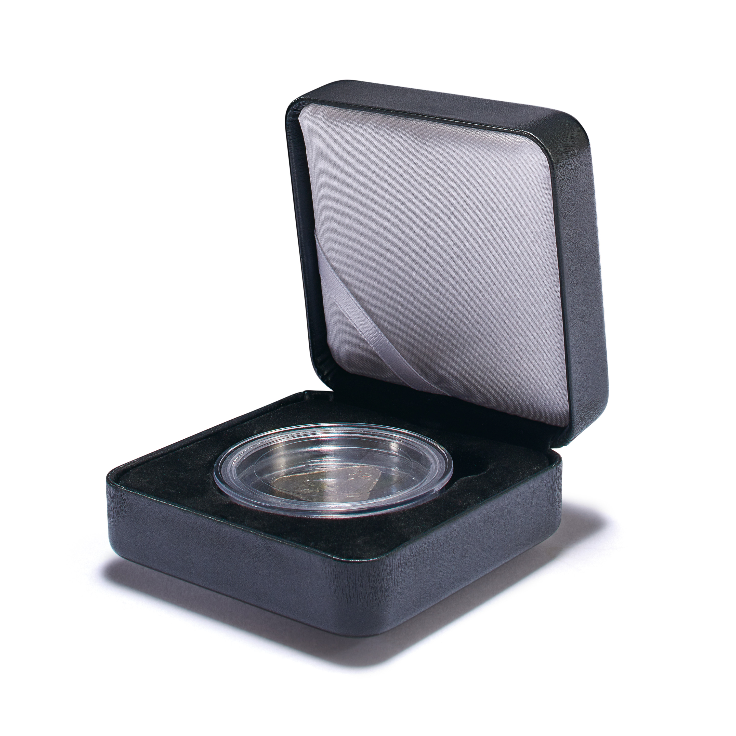 Sturdy metal housing with padding wrapped in fine grain black leatherette. Velvet inlay with black velour-like surface and one round cavity suitable for LEUCHTTURM MAGIC CAPSULES. Satin band on the lid cushion serves to hold a certificate you may have.