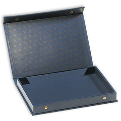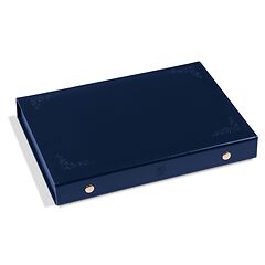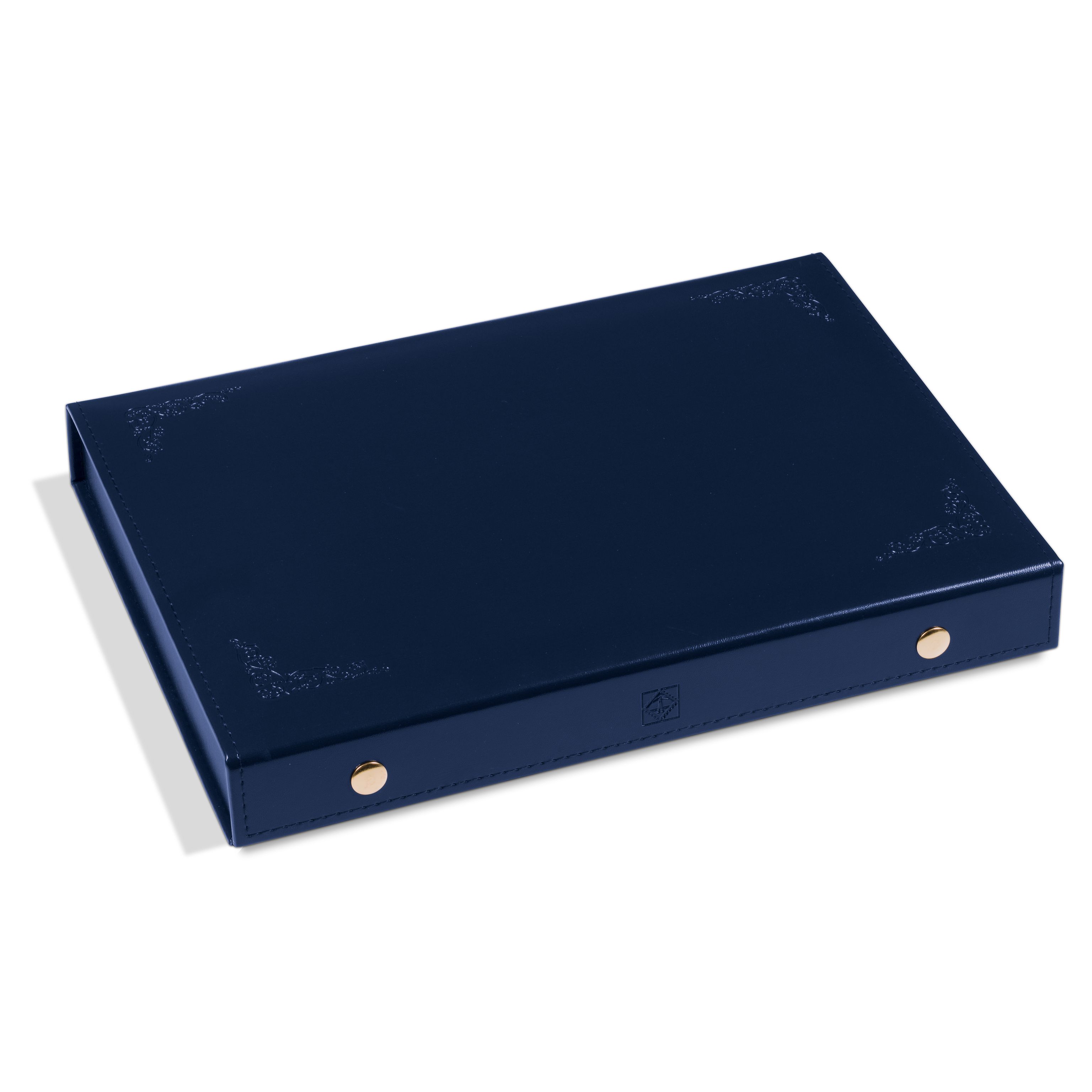 Presentation case without trays, in dark blue with high-quality leatherette and decorative engraving on lid. Bookbinder's quality, double snap-button closures in brass. Overall size: W 360 x L 250 x H 50 mm (W14" x L10" x H2").