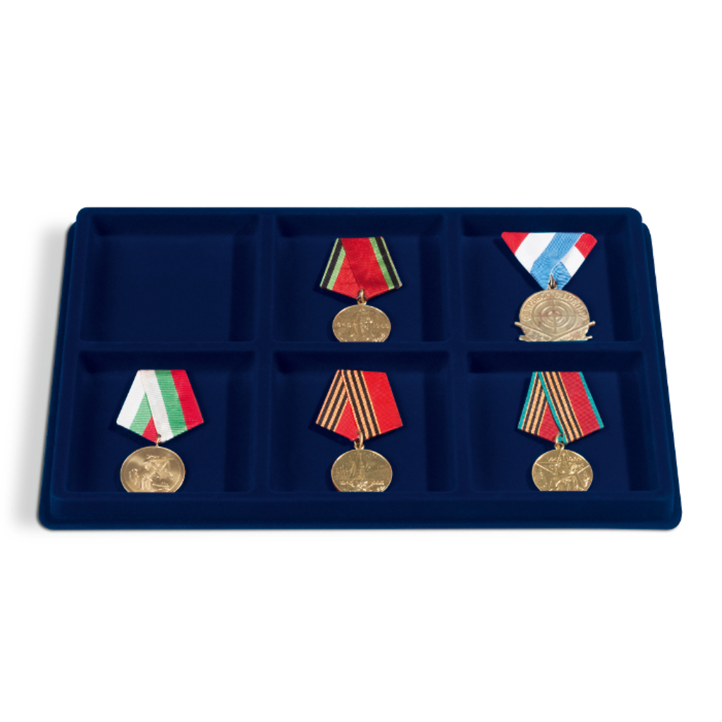 Coin tray with 6 square compartments in size 95 x 95 mm (3 3/4 x 3 3/4") and with an internal height of 17 mm (5/8") for large collector's items, such as medals, decorations, watches, jewelry, fossils, minerals etc. Suitable for all coin cases which can hold L-sized trays. Covered with velour material. Color: blue. Pack of 2. Overall size: 334 x 220 (13 1/8 x 8 5/8").