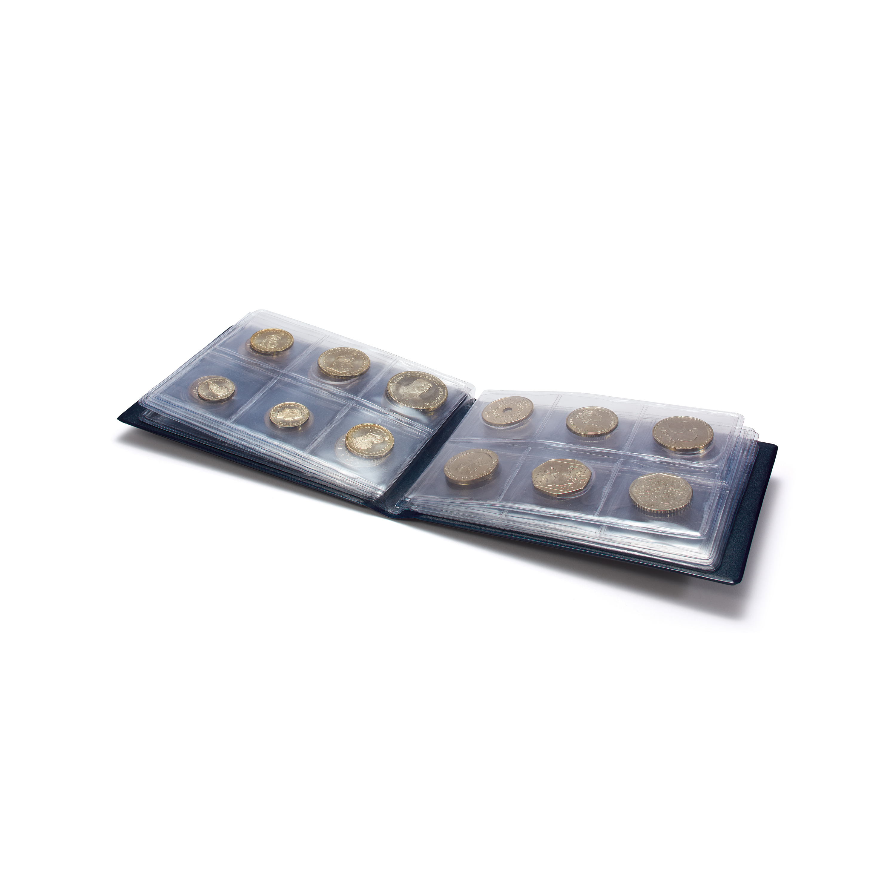 Coin wallet containing 8 sheets, each with space for 6 coins up to a diameter of 33 mm. Overall size:150 x 105 mm (6 x 4"). Free of chemical softeners, durable rigid PVC sliding inserts.