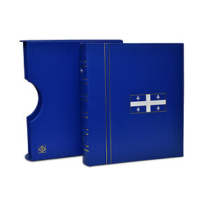 Classic GRANDE binder with slipcase in Quebec blue with a coloured embossing on cover and spine featuring the Quebec flag and golden “QUEBEC” letters.