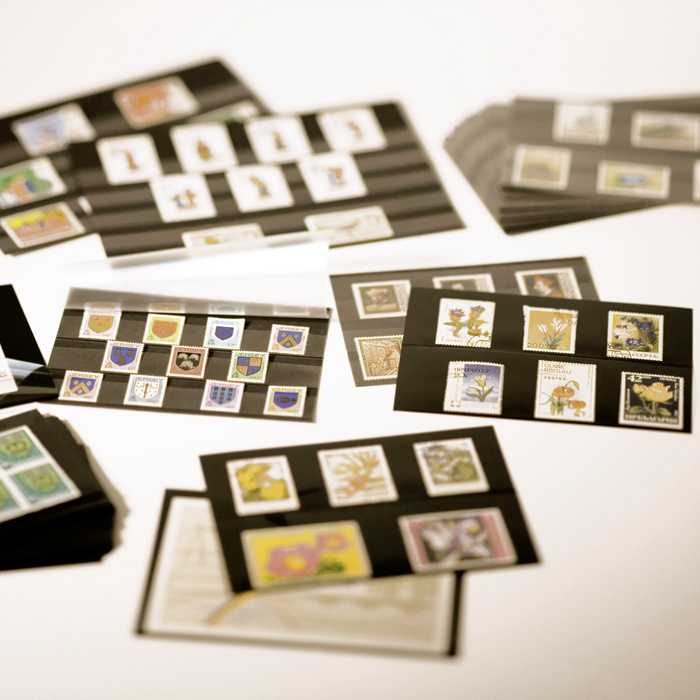 The cards made of cardboard have on the front clear strips of rigid PVC in different numbers. Ideal for example sets or vintages.