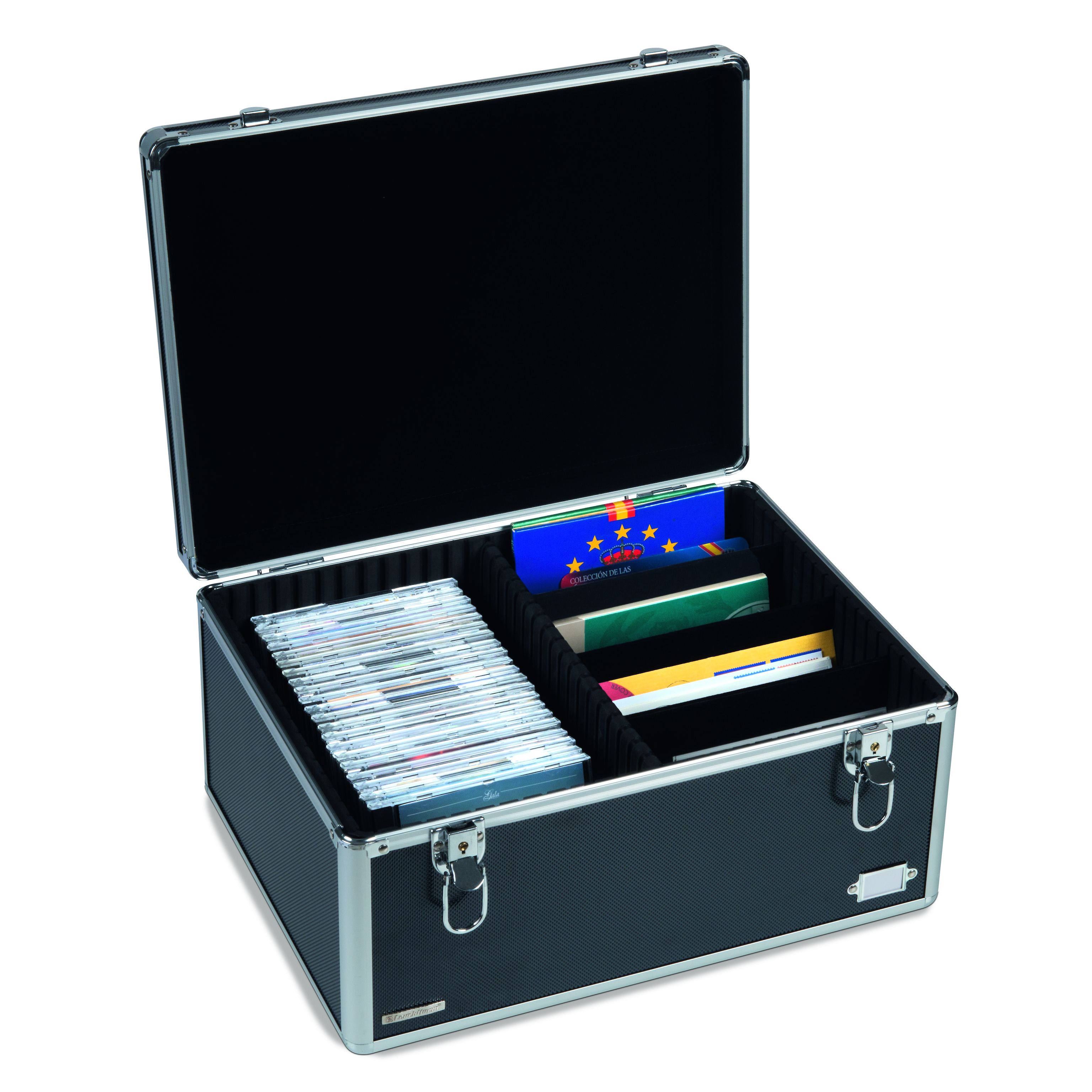 A collector case for safe and convenient storage of coin sets, CDs, approval cards, postcards, banknote cases. Flexible compact storage provides space for collectors’ items up to a height of 168 mm (6 5/8") and width of 370 mm (14 3/4"). Holds up to 1.500 postcards, 65 wide CD pockets (jewel case), 130 narrow CD pockets (slim case). Overall size: 400 x 225 x 315 mm (15 3/4 x 8 7/8 x 12 3/8”).