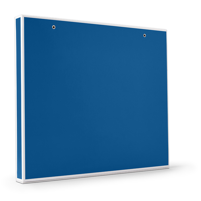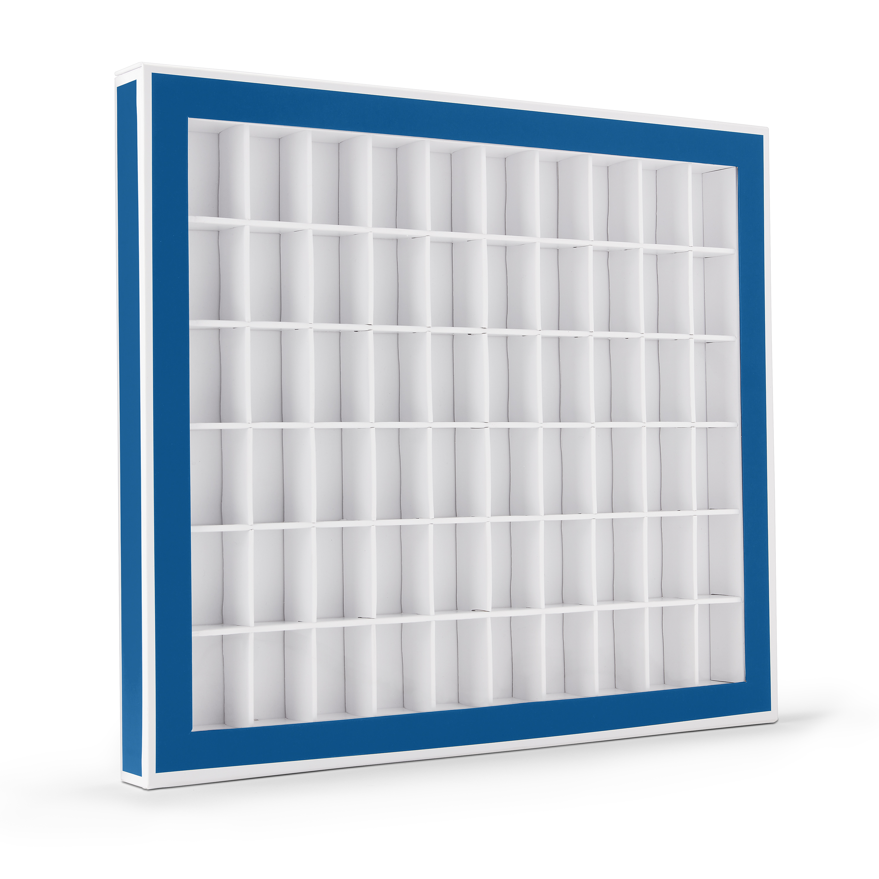 Box made from strong card in a blue design, featuring integrated partitions. 60 compartments 50 x 36 x 33 mm (2 x 1 3/8 x 1 1/4") in size. The hinged lid with its large viewing window and integrated, unobtrusive magnet lock simultaneously protects and displays your collection. Labeling field on the side for individual labeling of your collection. Overall size: 395 x 338 x 38 mm.face="Cambria Math" size=2> (15 1/2 x 13 1/4 x 1 1/2)