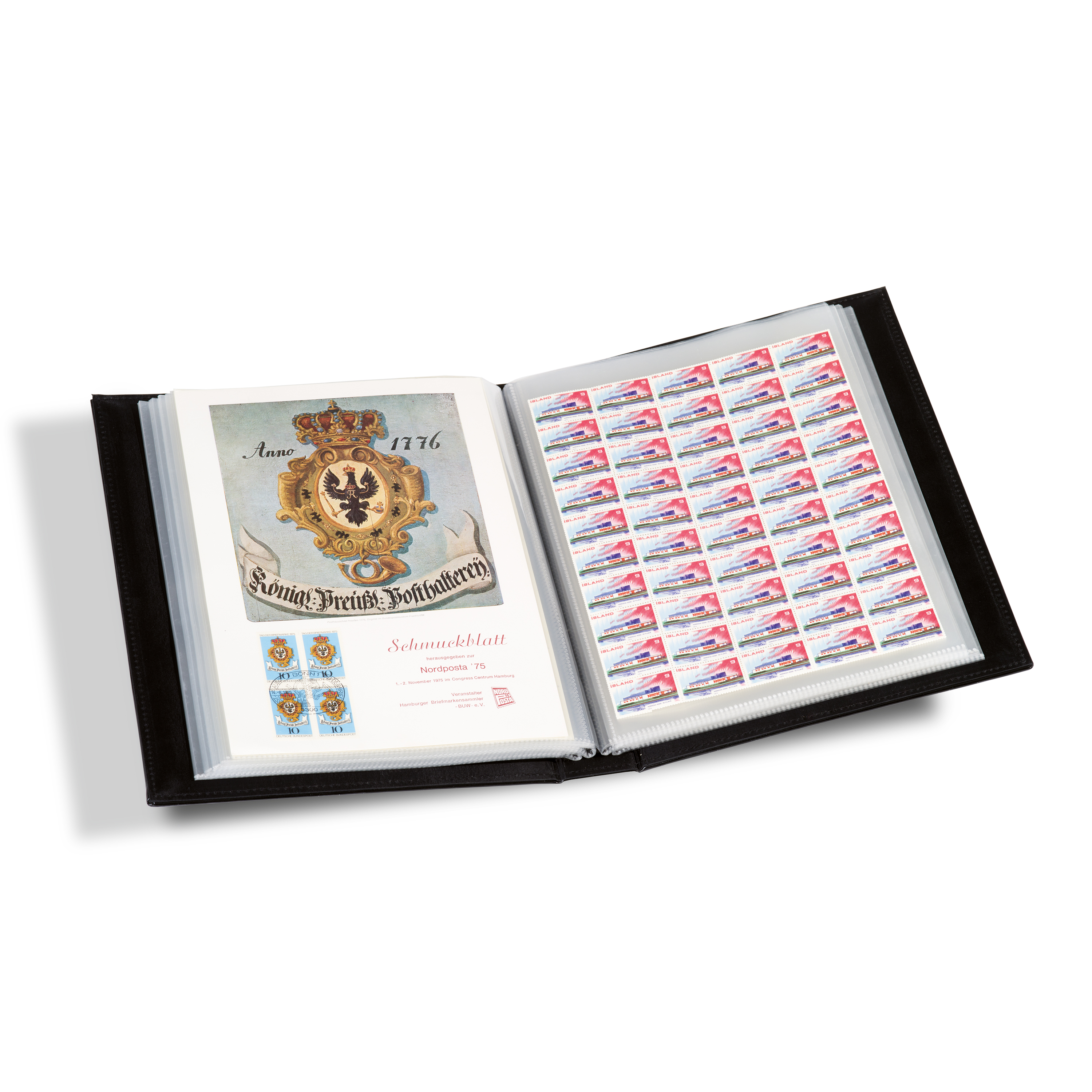 High-quality document album for storing small stamp sheets, bonds/historical documents, references, certificates and other assorted A4 documents. Includes sturdy plastic sheets to store and display your documents in style. Sheet format: 212 x 300 mm (8 3/8 x 11 7/8"). Quality workmanship with sewn edges and Sophisticated leatherette cover. Colour: black.