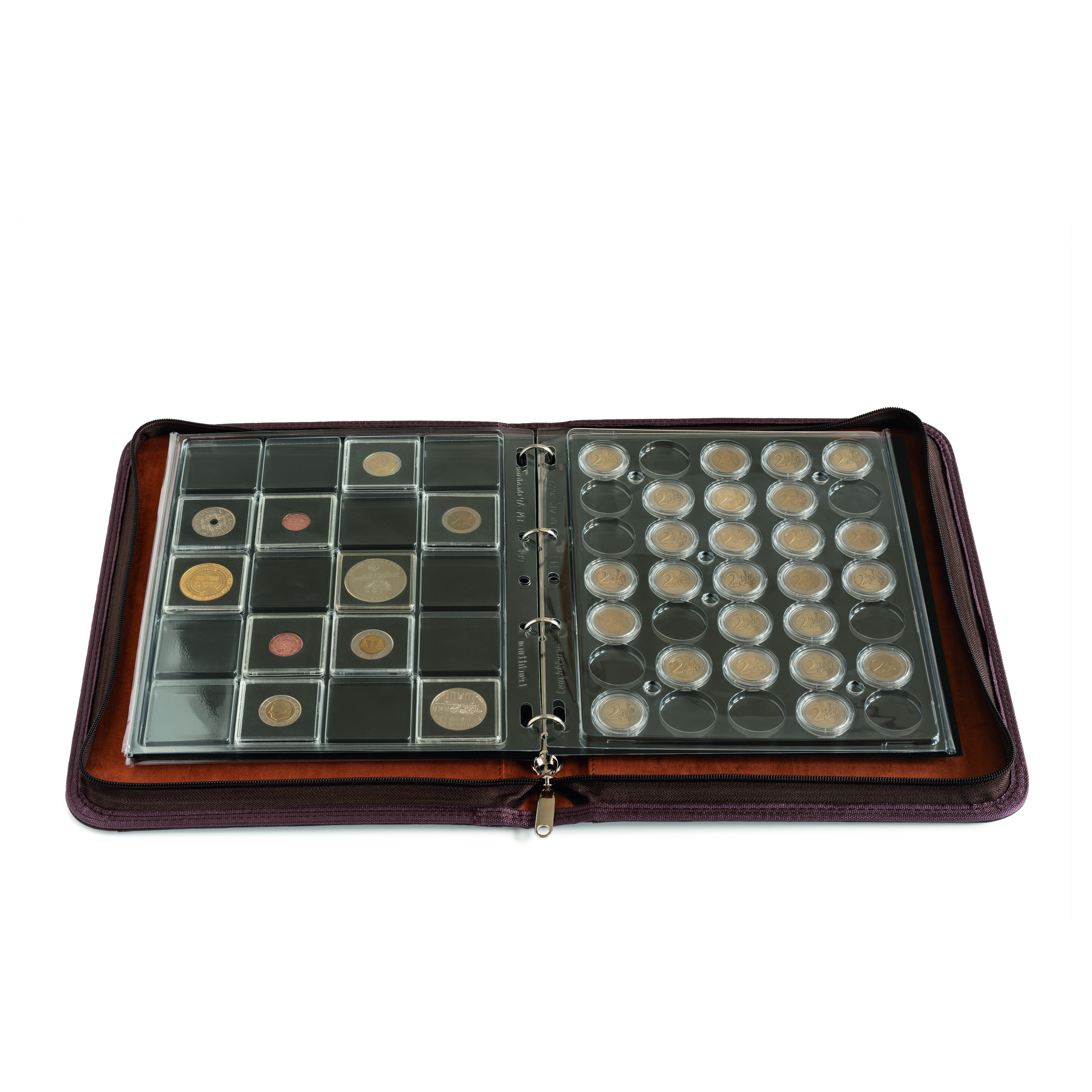 Premium „KURT” ring binder portfolio in leather-look for the storage of coins, stamps, banknotes, postcards, and much more. You collection if optimally protected from damage and loss by the sturdy zipper closure. Capacity up to 30 GRANDE sheets or 3 ENCAP coin sheets. Sturdy 4-D ring mechanism. Outer size closed: 350 x 270 x 35. Sheets not included.