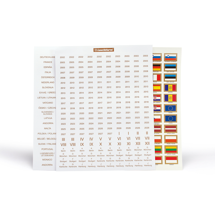 For labelling neutral coin sheets. Script nameplates for all Euro countries as well as for all German mints, volume (I-XII) and year numbers (1999-2024). Flag sets for the 24 euro countries, the small states San Marino, the Vatican, Monaco and Andorra as well as 2 European flags.