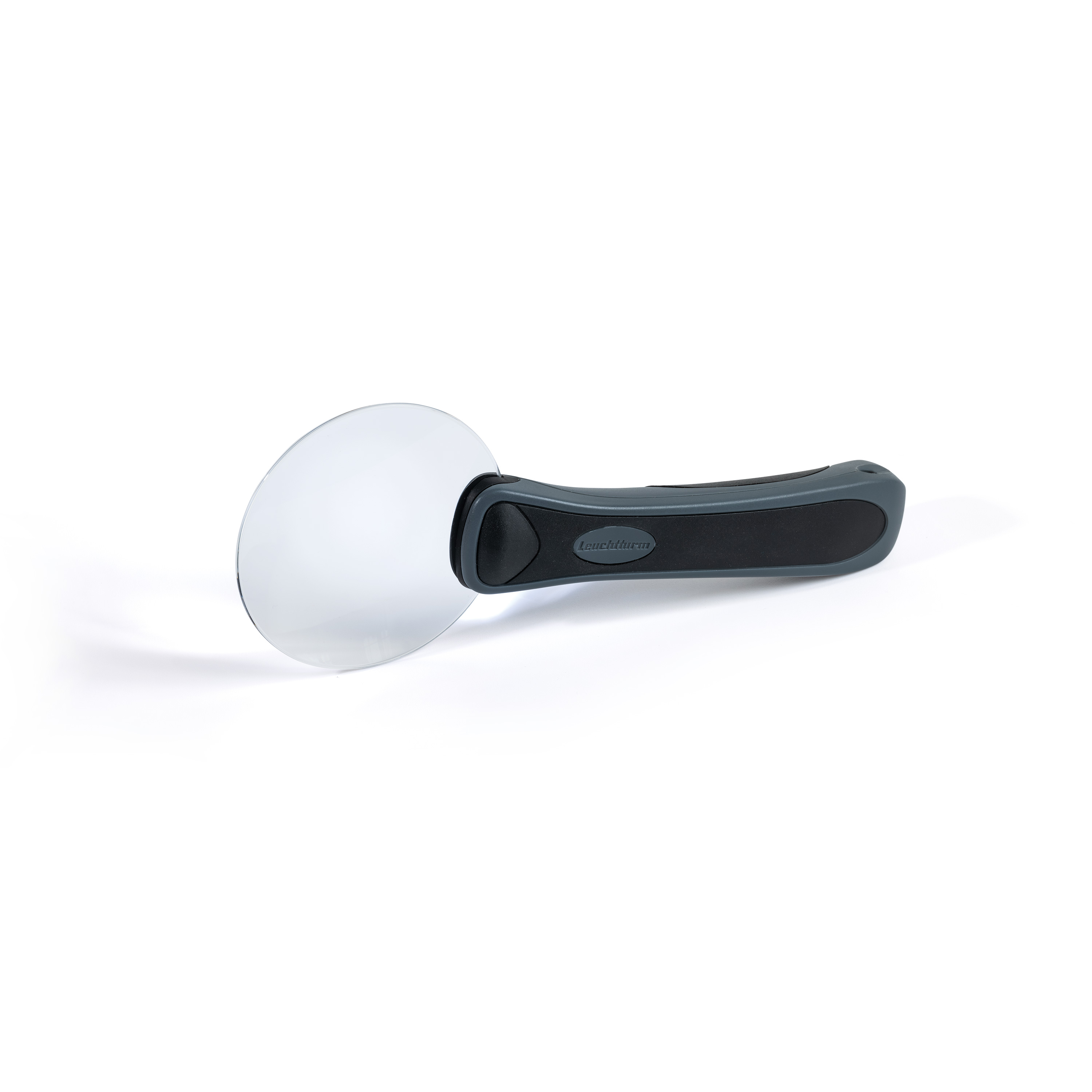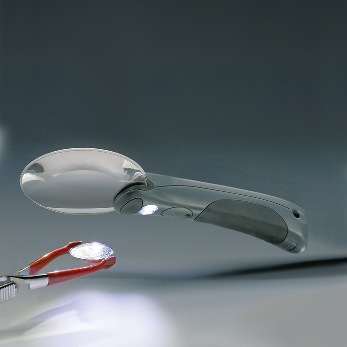 High-quality, frameless acrylic lens and ergonomically designed metal handle (chrome-plated) in a modern design. Excellent optimcal quality. Lens diameter: 90 mm (3 1/2"). 2.5x magnification. Battery operated, 3x button cell SR 54 to IEC standard (included), 2 very bright LEDs. Soft material cover to protect lens.