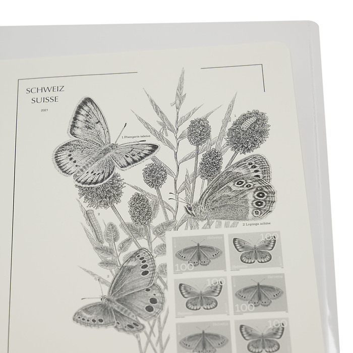 SF protective covers in sizes which match the stamps, made from clear, anti-glare polystyrene film, free from chemical softener are glued to the card of the albums. The protective covers hold the stamps in place and prevent sticking. They also protect your collection from dust and moisture.