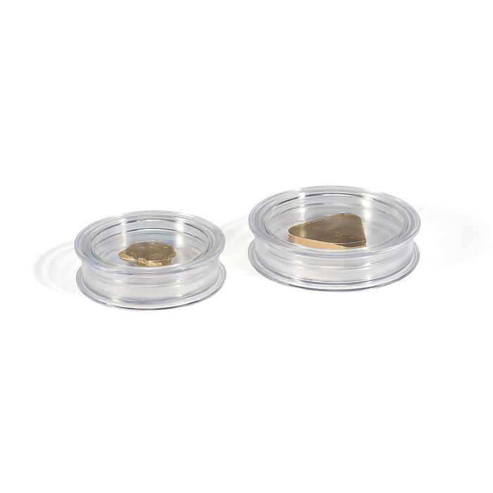 Ancient, thick or in a triangle shape – MAGIC CAPSULES is the perfect solution for your very special coins. The membrane inside holds the coin tight and lets the coin float. This allows further to store items like gemstones. With its rim the capsule could be opened easily although it is closed tight. We recommend our MAGIC CAPSULES for coins with a thickness up to 7 mm. The smaller MAGIC CAPSULES S are recommended for coins up to 27 mm diameter. If you like to store coins with a diameter up to 32.5 mm we recommend MAGIC CAPSULES L. Choose between packs of 6 and 50. Made of scratch-resistant polysteryne. Outer height: 13 mm. Outer diameter: 46 mm (MAGIC CAPSULES S) / 54 mm (MAGIC CAPSULES L)