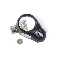 Handy desk magnifier featuring a high-quality acrylic lens (lens diameter: 65 mm) and 5x magnification. 6 white high-tech LEDs provide uniform illumination and are inconspicuously integrated into the design. These have 3 different brightness settings. Frame in black with non-slip handles at the side. Includes three batteries (AAA). Dimensions: (W/L/H) 95 x 140 x 47 mm (3 3/4 x 5 1/2 x 1 7/8")
