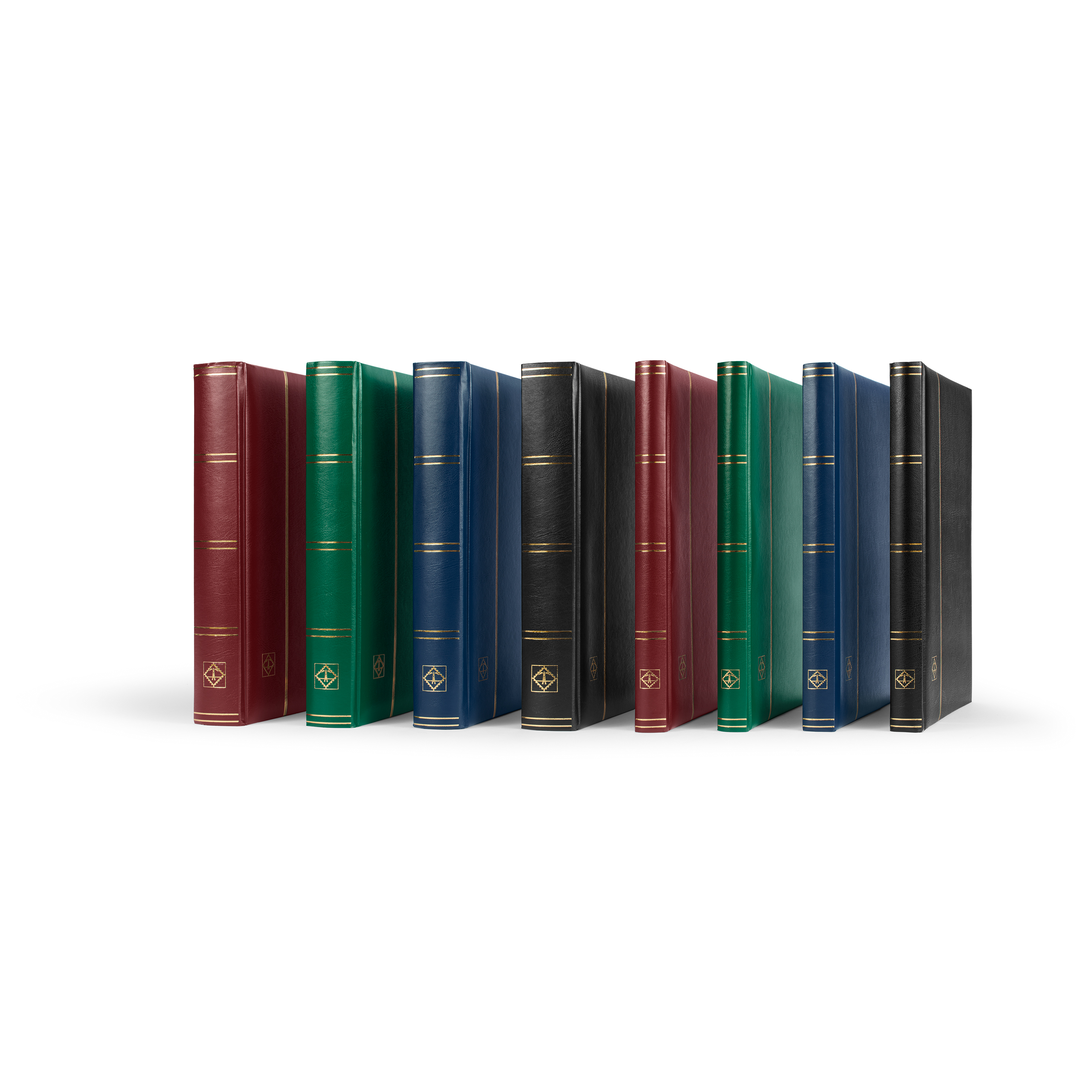 COMFORT A4 stockbook with 32 or 64 white pages, padded leatherette cover. The book features black 9 cear glassine strips per page, double interleaves with double hinge binding.