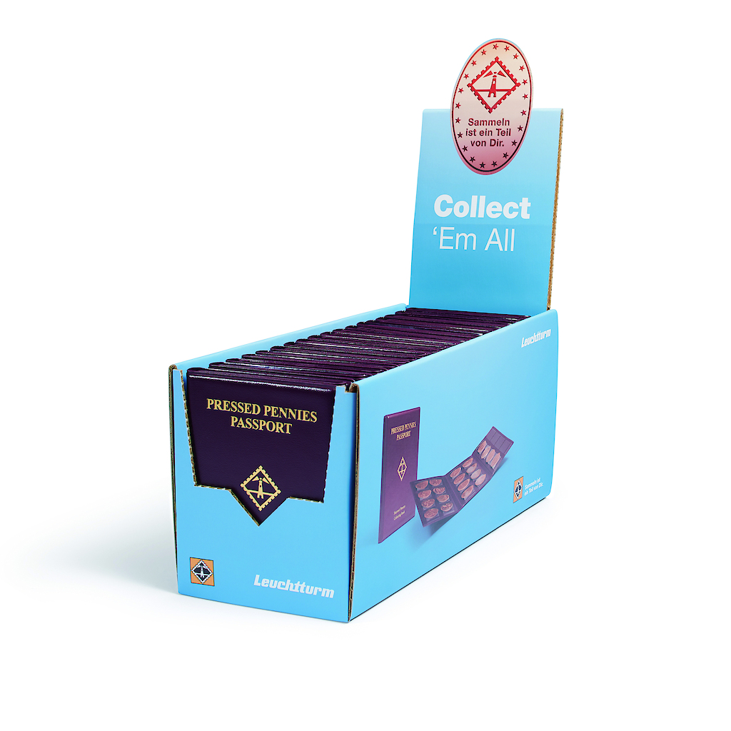 The 20 albums are packaged in an attractively designed cardboard display for retailers. The display is easy to open thanks to the perforation on the front and can be placed directly on the shelf. The lid of the display can be folded up as a pop-up so that the display can be presented in an eye-catching way. Each album in the display is individually shrink-wrapped and comes with a flyer summarising the most important product features in German and English. In addition, each display contains a sticker for a pressed pennies vending machine to draw attention to the album directly on site and guide customers into the shop.