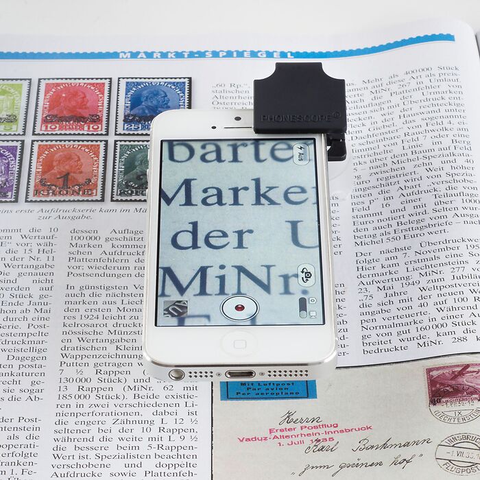 The PHONESCOPE macro lens turns your smartphone or tablet into a powerful digital microscope with up to 60x magnification. The finest details such as the mint markings on coins, the stamp printing processes and much more can be recognised and checked using the camera function on your smartphone. The enlarged details can be saved as a photo or video.
