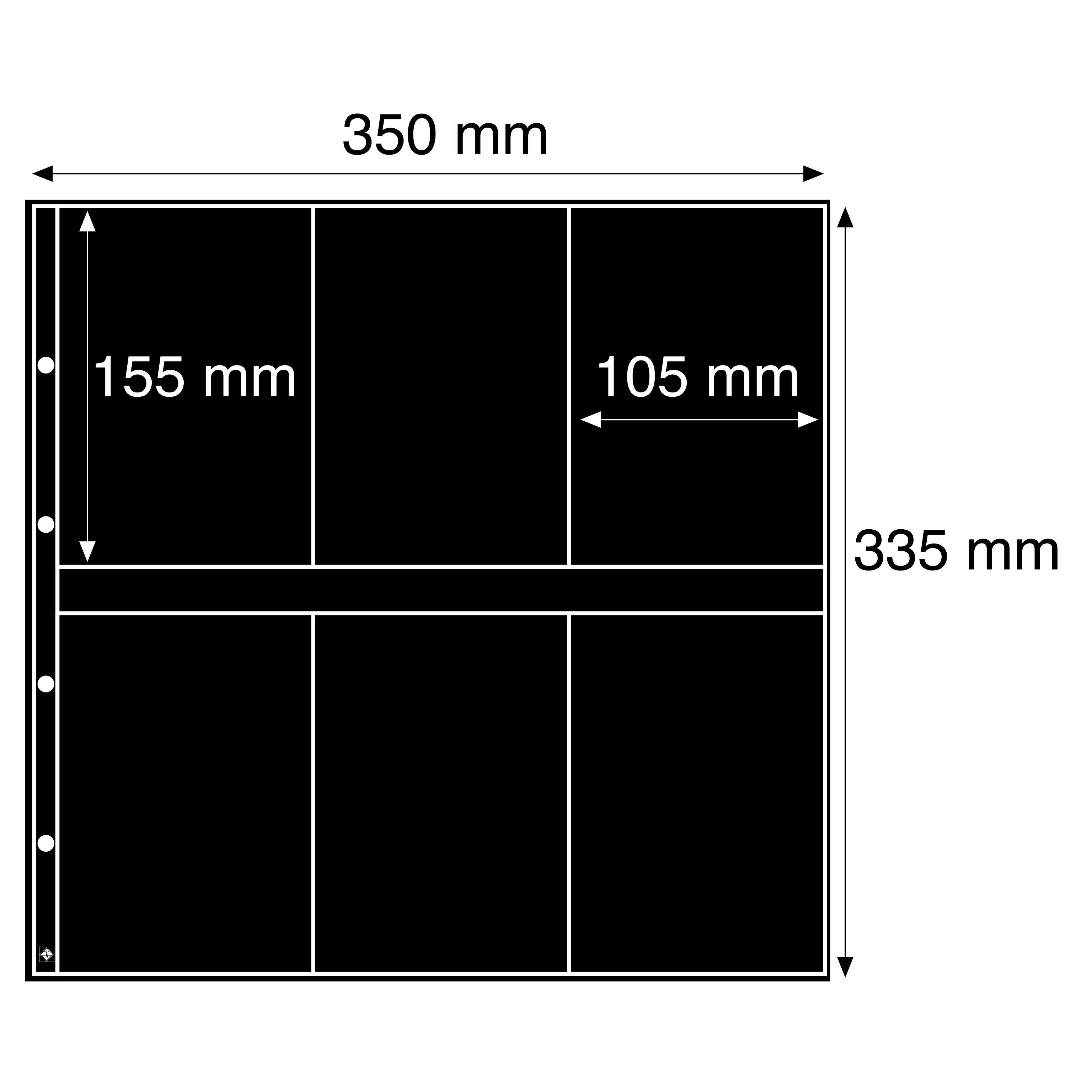 Plastic pocket made of special film, free from chemical softeners. For new postcards, in portrait format. Pocket size (H/W): 335 x 350 mm, compartment size (H/W): 155 x105 mm. Black.