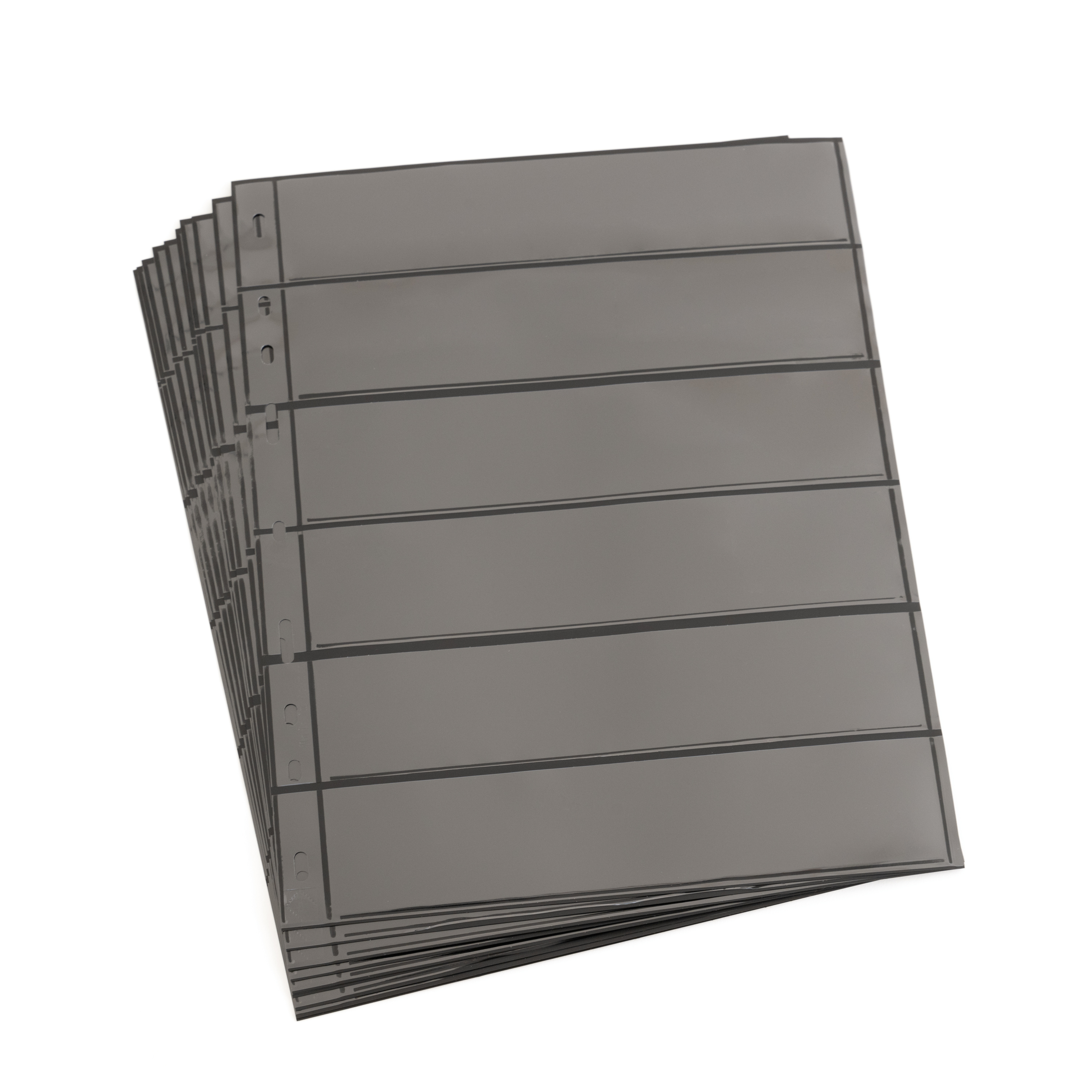 The OPTIMA sheets are made of a special film free of chemical softeners, 6-way division. Ideally-suited for stamps. Sheet size. 180 x 35 mm. Overall size: 202 x 252 mm. Colour: black