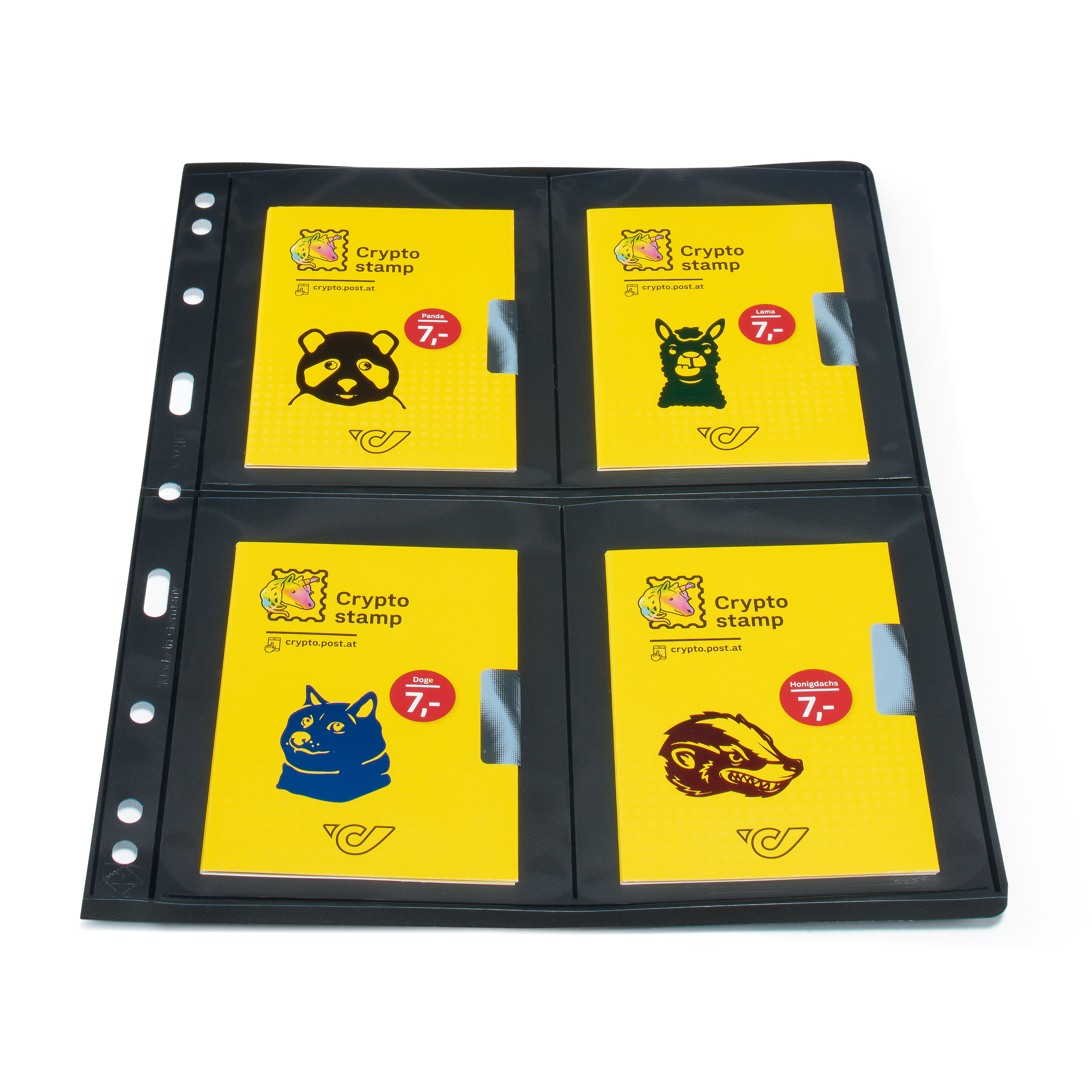 Plastic pockets with archive-safe special film, free of chemical softener. 2-way division and vertically divided. VARIO sheet size: (W/H) 96 x 128 mm. Black.