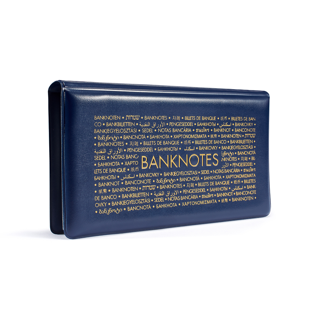 Handy wallet with 20 pockets for banknotes up to 170 x 85 mm (6 2/3 x 3 1/3" W/H). The transparent pockets allow you to view the front and reverse sides of the banknotes. The handy size means the wallet can easily be carried in a bag, briefcase or jacket pocket and is therefore perfect for journeys and when trading. Padded cover. Gold imprint on cover. Colour: dark blue. Overall size: 195 x 110 x 20 mm (7 2/3 x 4 1/3 x 3/4").