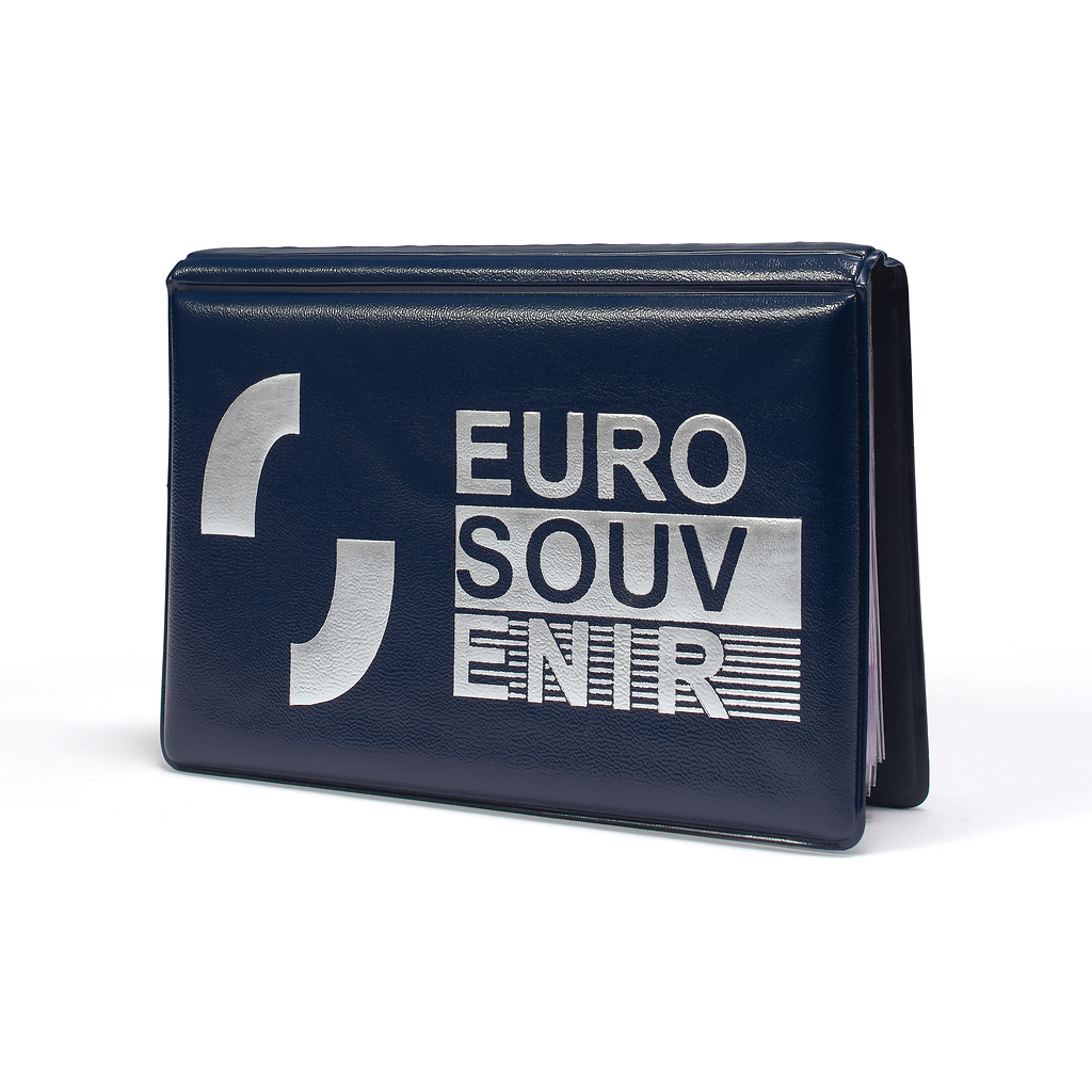 This pocket album with 20 sturdy, bound transparent sheets has space for 40 “Euro Souvenir” banknotes (when both sides of the sheets are used). The sheets are made from plastic, are free from chemical softener and provide safe storage and protection from dirt. Thanks to the compact size, the pocket album will fit easily into any handbag or briefcase, rucksack or travel bag and is therefore ideal for travelling, fairs or trading. Padded cover in dark blue with silver-coloured embossing. Overall size: 150 x 95 x 20 mm (5 7/8 x 3 3/4 x 3/4").