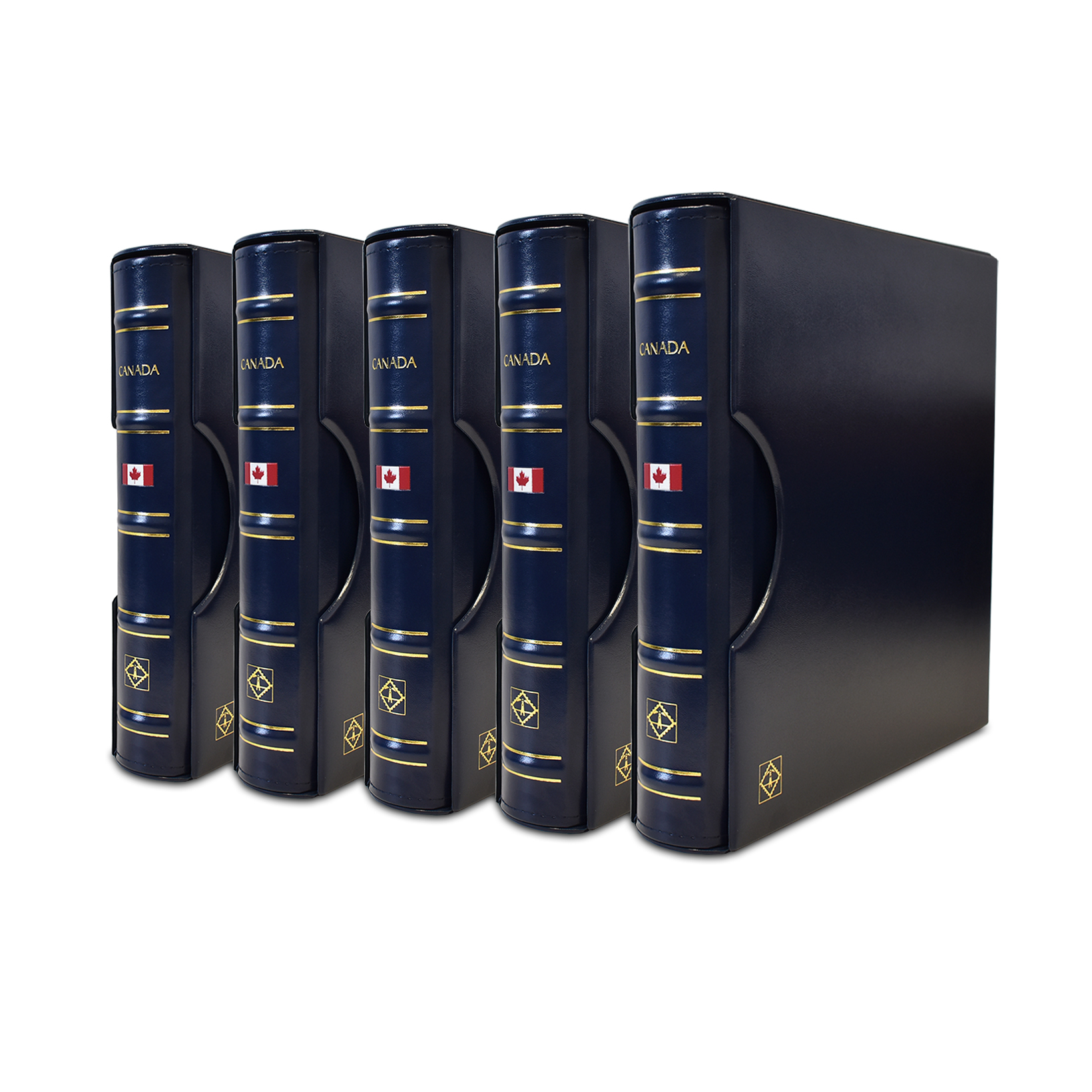 The preprinted stamp album set Canada consists of 5 blue stamp albums in classic design. Each stamp album includes a turn-bar binder, preprinted pages with mounts and a matching slipcase.