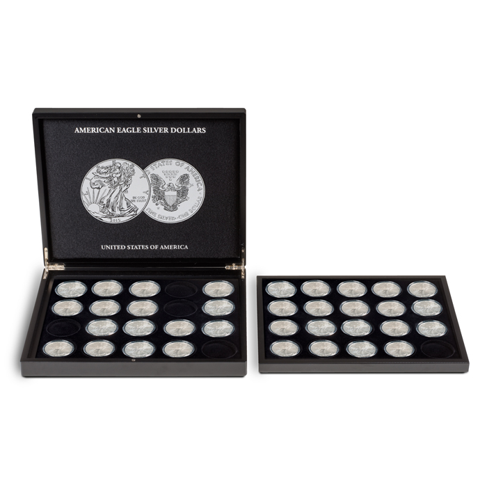 dollars in LIGHTHOUSE CAPS 41 coin capsules* (not included). One tray covered in black velour with 20 spaces. Black satin lid cushion and secure magnetic closure. American Silver Eagle coin designs in silver-colored printing on lid and inside cushion.