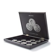 Elegant black presentation case for collecting 20 Britannia silver coins (1 oz.) in LEUCHTTURM capsules (CAPS 39 / CAPS 40). 1 tray featuring a black velour surface and 20 round cavities (Ø 45 mm / 1 ¾"). Silver-colored printing on lid and cushion with coin design. Lid cushion is up-holstered in black satin. Secure and unobtrusive magnetic lock. Overall size: 305 x 30 x 245 mm (12 x 1 ¼ x 9 ?"). Capsules are not included.