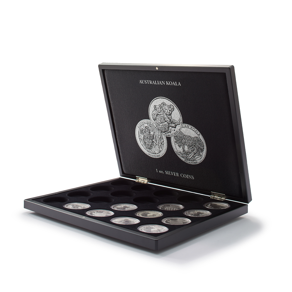 First minted in 2007, the Perth Mint has issued silver bullion coins featuring annually changing designs of the country’s beloved Koala. These coins are released in various weights and denominations, with the most popular being the 1 oz. coin. Elegant presentation case for 1 oz. Koala silver coins in their original capsules (not included). One tray covered in black velour with 20 spaces, each with a diameter of 1 3/4" (45,4 mm). Black satin lid cushion and secure magnetic closure. Koala coin designs in silver-colored printing on lid and inside cushion.