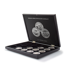 Item number: 357306Elegant black presentation case for collecting 20 Somalia African Wildlife Elephant silver coins (1 oz.) in LEUCHTTURM capsules (CAPS 39).