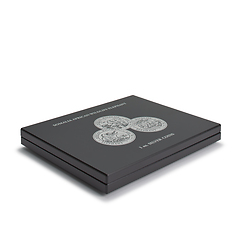 Elegant black presentation case for collecting 20 Somalia African Wildlife Elephant silver coins (1 oz.) in LEUCHTTURM capsules (CAPS 39). 1 tray featuring a black velour surface and 20 round cavities (Ø 45 mm / 1 ¾"). Silver-colored printing on lid and cushion with coin design. Lid cushion is up-holstered in black satin. Secure and unobtrusive magnetic lock. Overall size: 305 x 30 x 245 mm (12 x 1 ¼ x 9 ?").