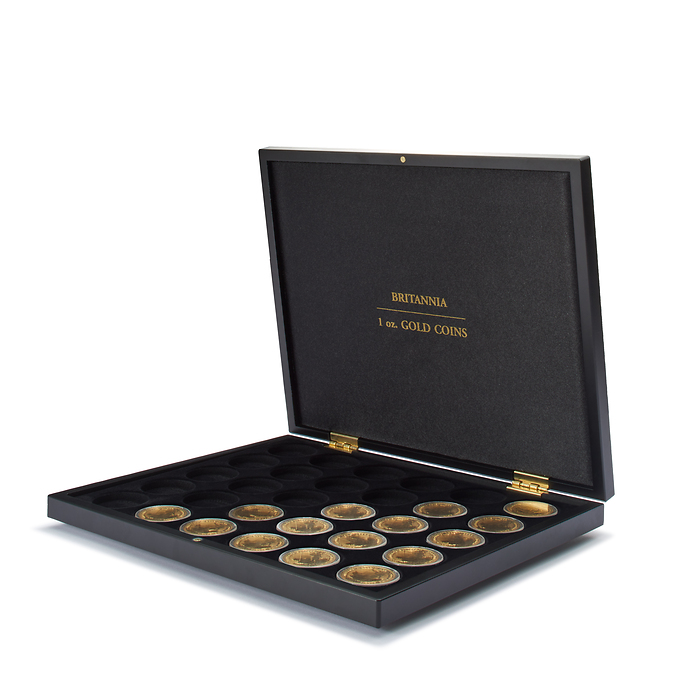 - Elegant black coin case for 30x Britannia gold coins (1oz.) in Leuchtturm capsules (No.345041)