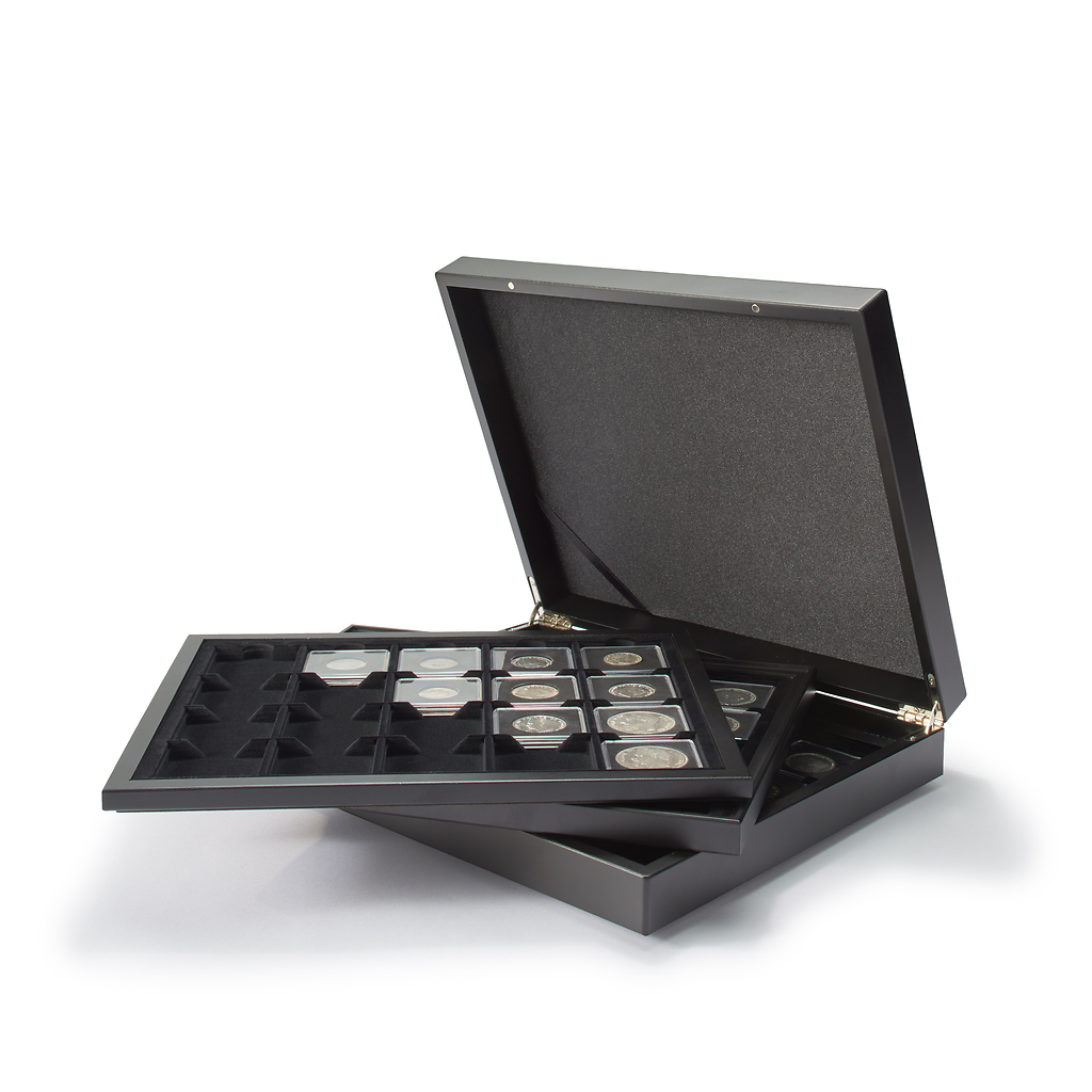 High-quality, black presentation case to house 60 QUADRUM coin capsules or coin holders. 3 trays, each featuring a black velour-effect surface and 20 square ports (50 x 50 mm). Trays particularly sturdy thanks to a wooden frame. The lid cushion is covered in black satin, and the case features a secure and unobtrusive magnetic lock. Overall size: 330 x 270 x 55 mm (13 x 10 5/8 x 2 1/8").
