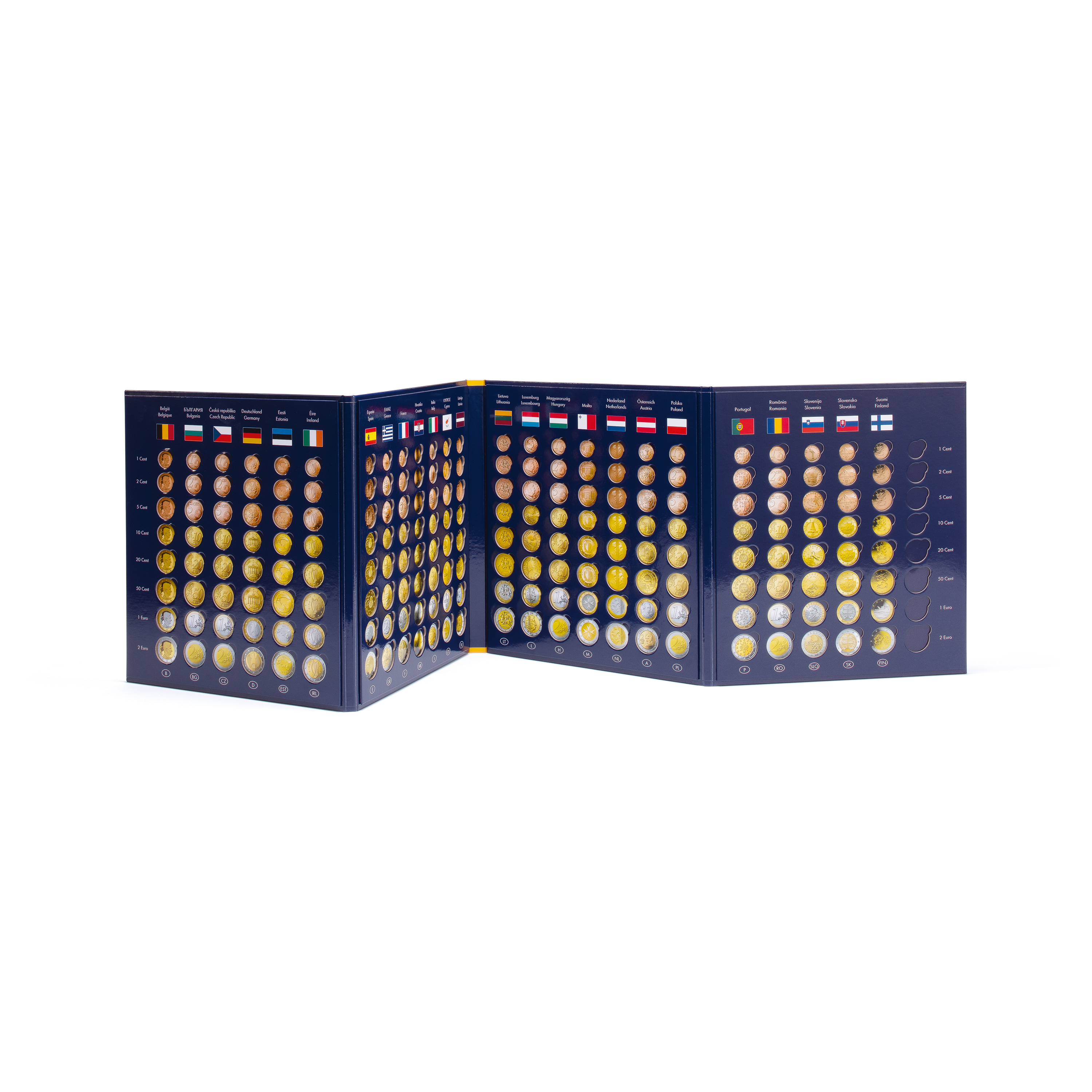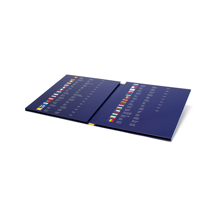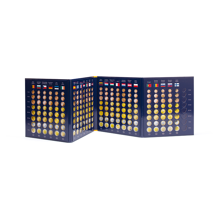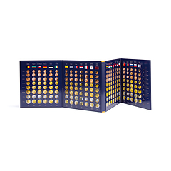 Colourful coin album made from high-quality, printed strong card featuring cut-outs for accommodating 26 complete euro coin sets (1-cent to 2-euro coins in circulation). This coin album features all euro-zone countries excluding the microstates of Monaco, San Marino, the Vatican and Andorra. Overall size (closed): 255 x 280 mm (10 x 11").