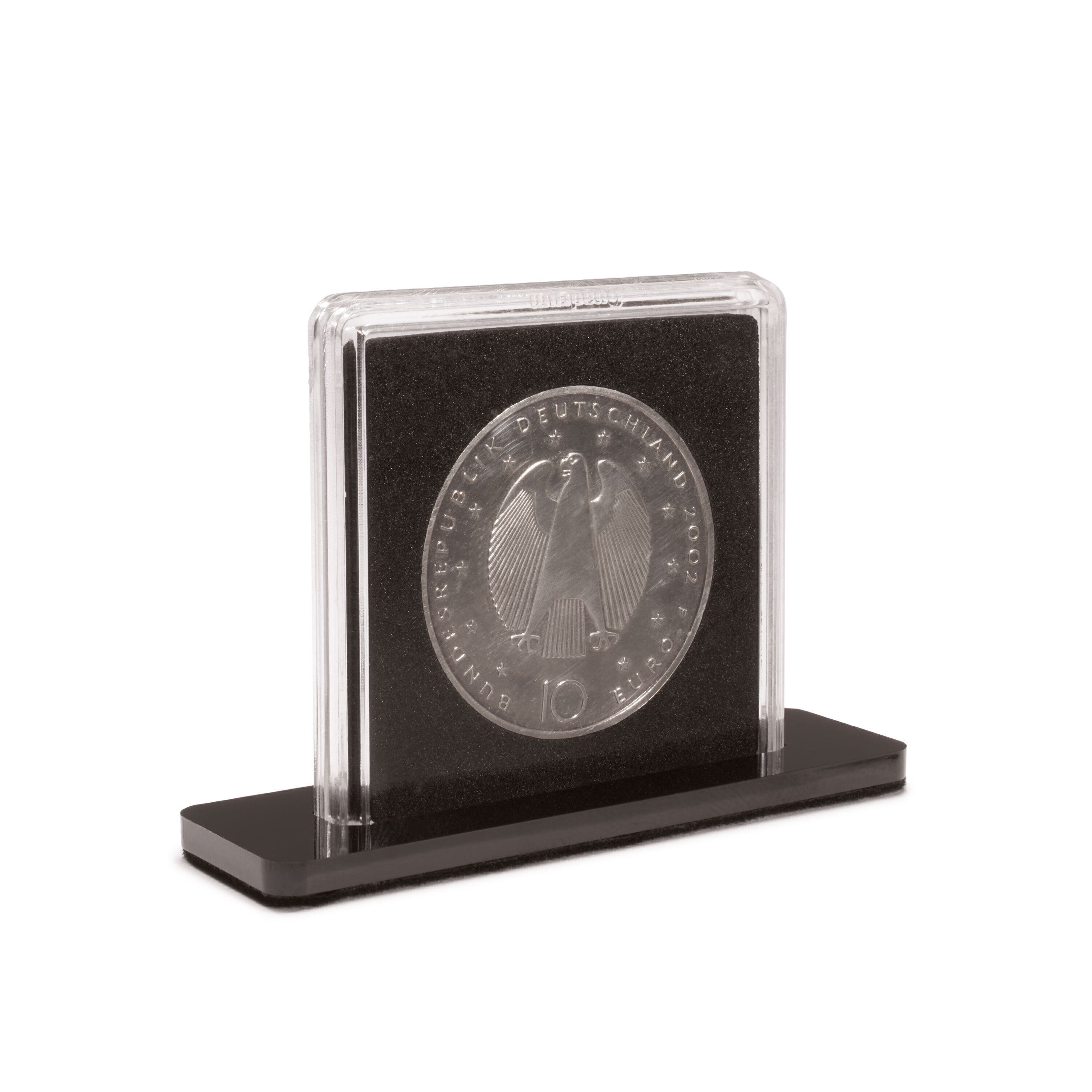 system, where coins can be stored securely and provide an attractive method of presentation. It is now also possible to store the oblong coin capsules vertically. The QUADRUM coin holder comes in glossy black and provides an inconspicuous and attractive way to store coins in a QUADRUM capsule. It is an eye-catcher when presented in a coin display cabinet. The QUADRUM capsule can be placed in the coin holder and taken out again when needed. The opening is precisely tailored to the QUADRUM capsule."