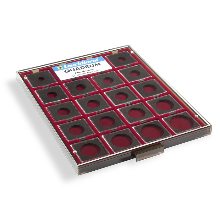 Bestückt mit 20 QUADRUMMünzkapseln für Münzen unterschiedlicher Durchmesser.