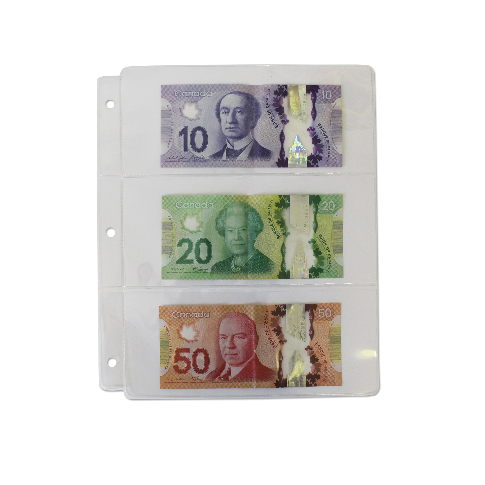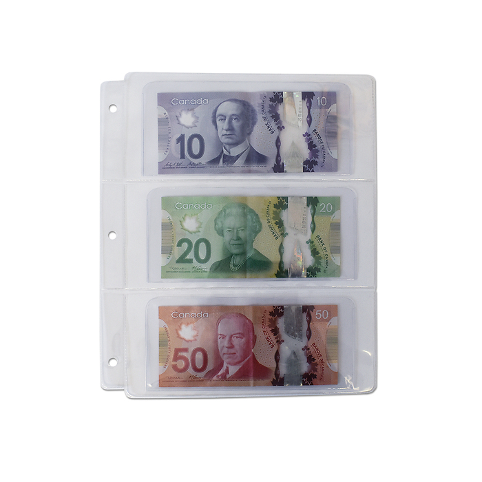 A perfect fit for all the 3-ring binders. Overall size 9 1/4 x 11" (235 x 280 mm). Free of acids and chemical softeners. 3 pockets for ideal protection of all banknotes or currency sleeves up to 8 x 3 1/4 " (205 x 85 mm). For all Canadian old and modern banknotes.