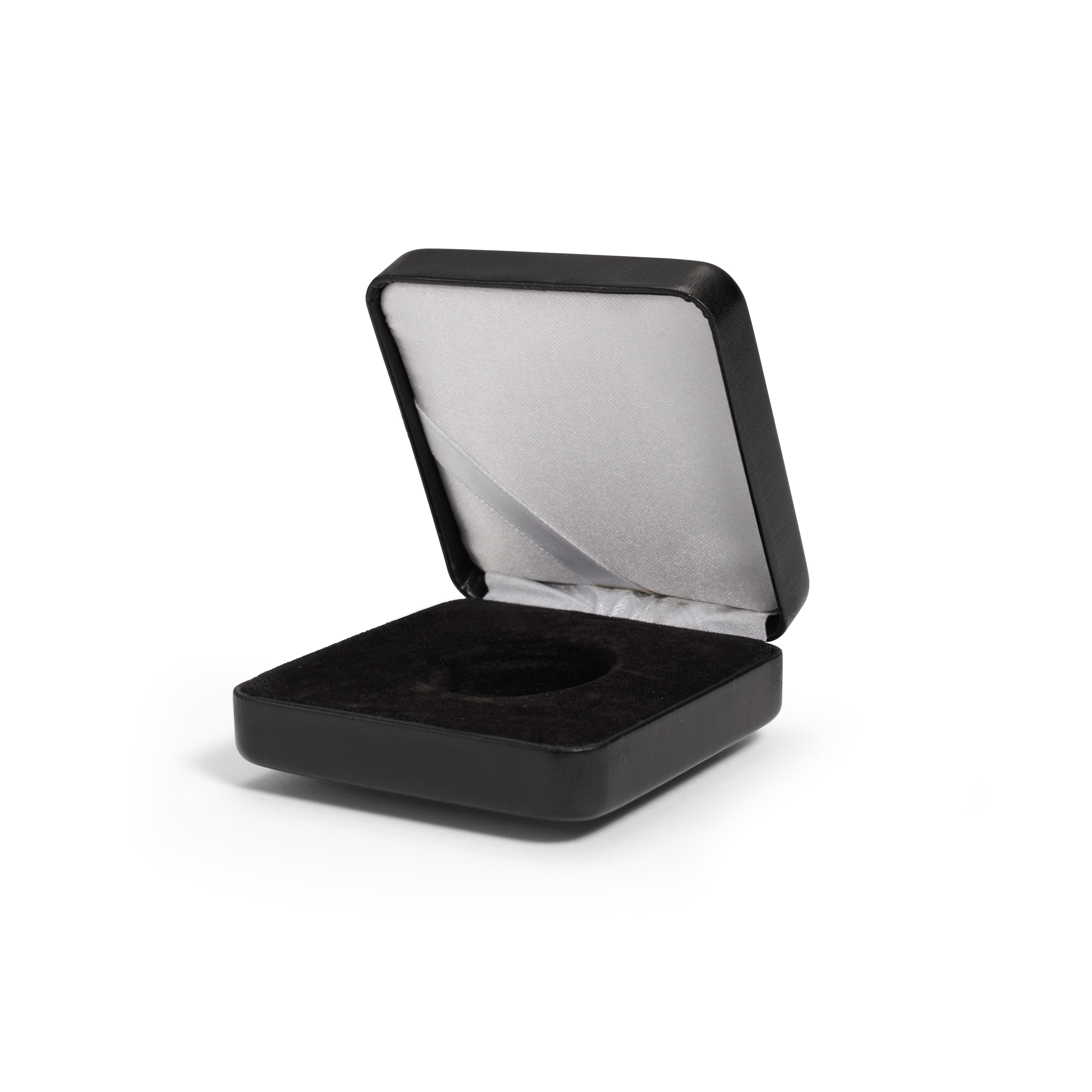 For the most elegant presentation of encapsulated coins may we recommend these high-quality coin boxes with silk-lined lid and black velvet inlay. A satin ribbon inside the lid can hold a personal message if desired. A sturdy metal frame protects the coin