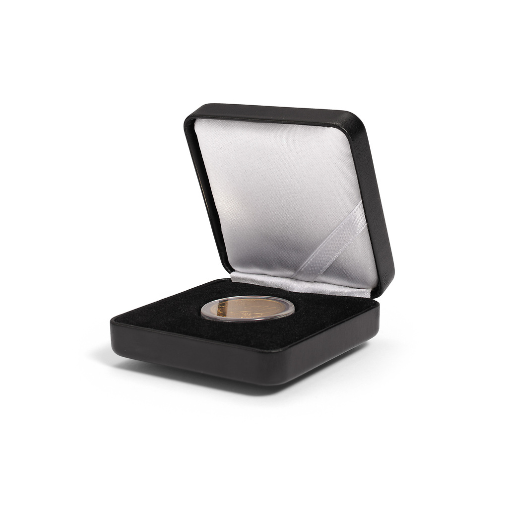 For the most elegant presentation of encapsulated coins may we recommend these high-quality coin boxes with silk-lined lid and black velvet inlay. A satin ribbon inside the lid can hold a personal message if desired. A sturdy metal frame protects the coin